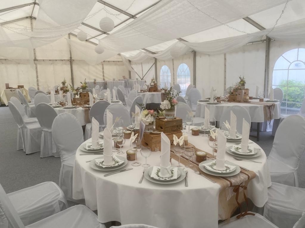 Feiern Sie Ihre Hochzeit wetterunabhängig im feierlichen Ambiente eines feierlich dekorierten Hochzeitszeltes.