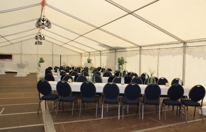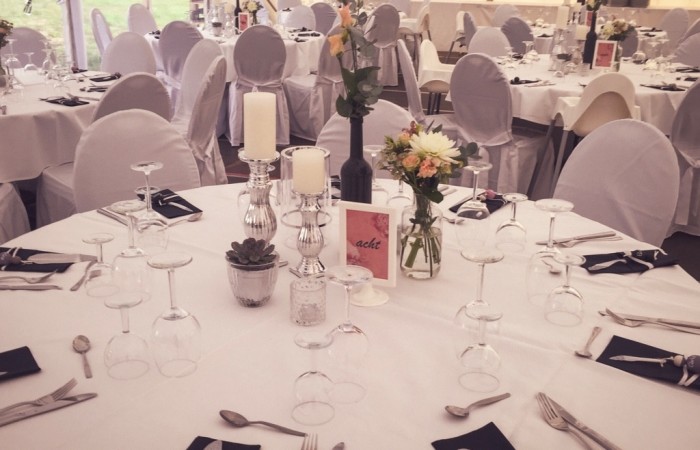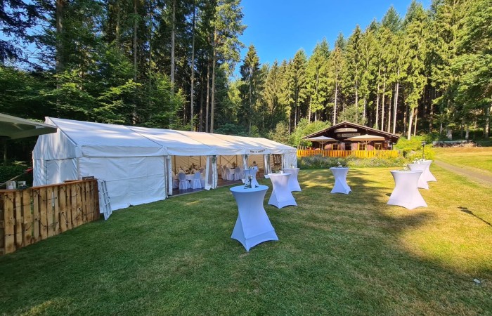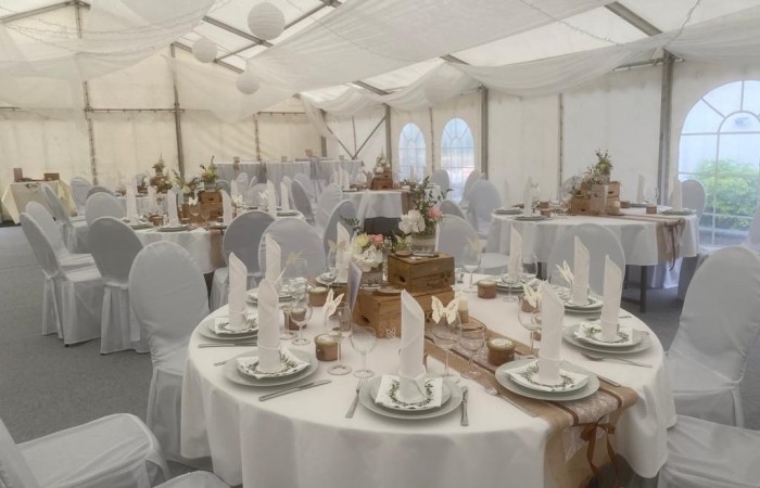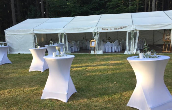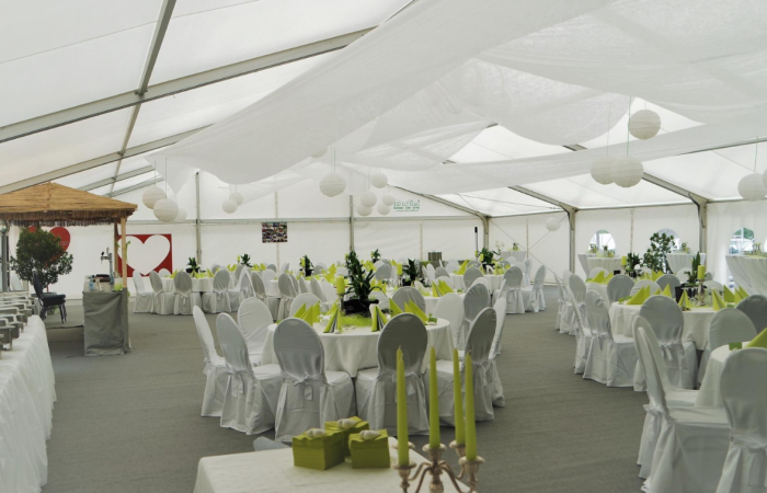 Feiern Sie Ihre Hochzeit wetterunabhängig im feierlichen Ambiente eines feierlich dekorierten Hochzeitszeltes.